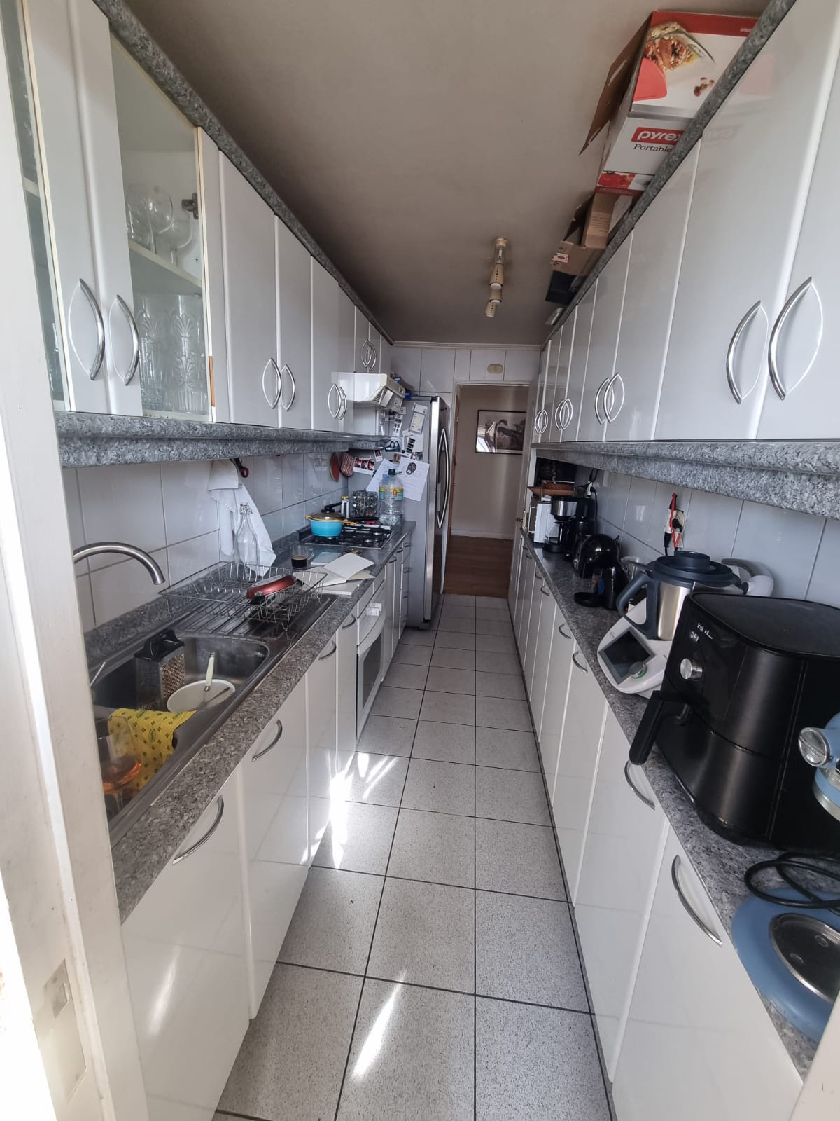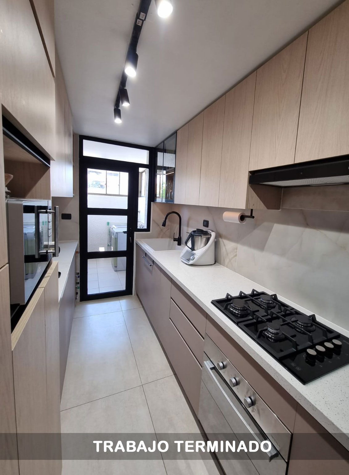 Modernizamos por completo esta cocina tipo pasillo y su logia, transformando un espacio tradicional en un ambiente contemporÔneo, funcional y visualmente armónico.