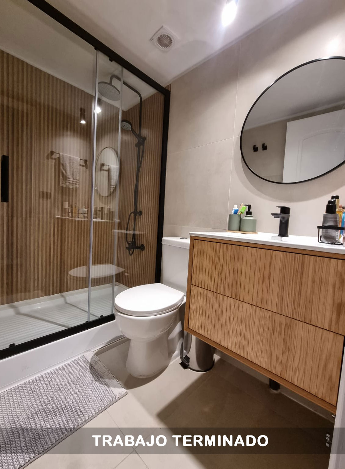 šæReemplazamos por una mampara de vidrio templado y perfilerĆa negra, aportando amplitud y un estilo contemporĆ”neo. El nuevo mobiliario en tono madera, combinado con la puesta en escena del lavamanos sobre cubierta y griferĆa negra, crea un contraste perfecto.