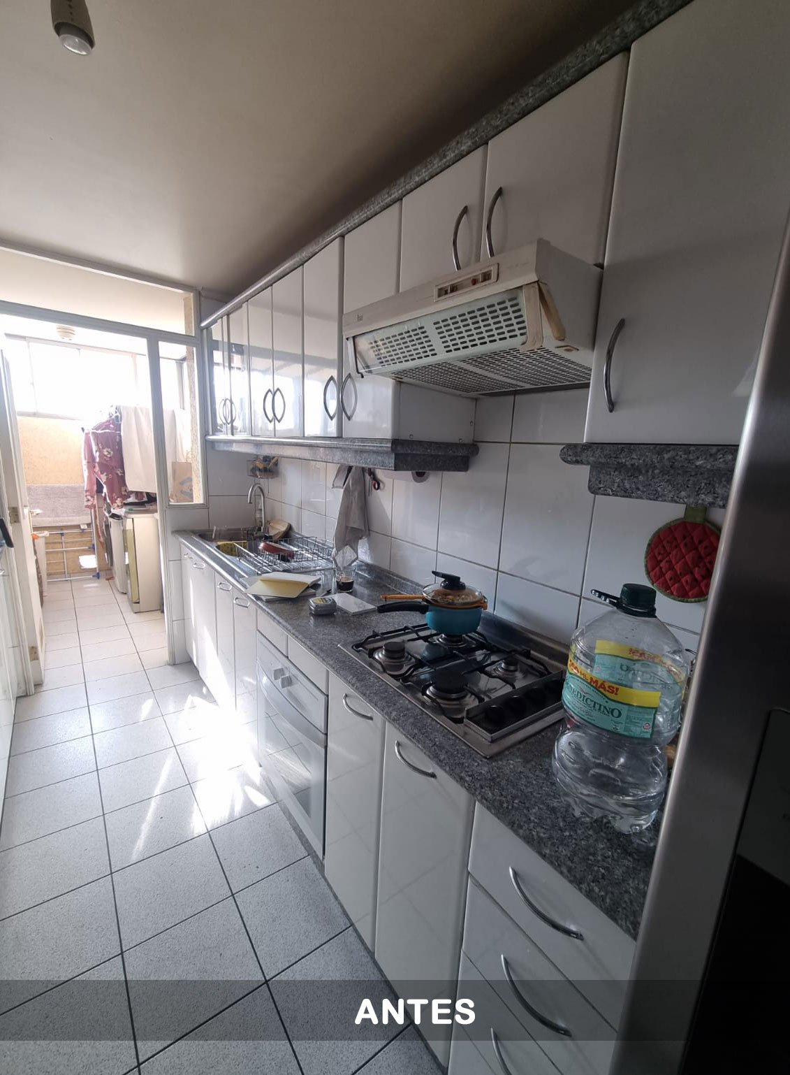 Integración visual con la cocina mediante continuidad de materialidades. Mejoramiento del orden, circulación y accesibilidad a instalaciones sanitarias.