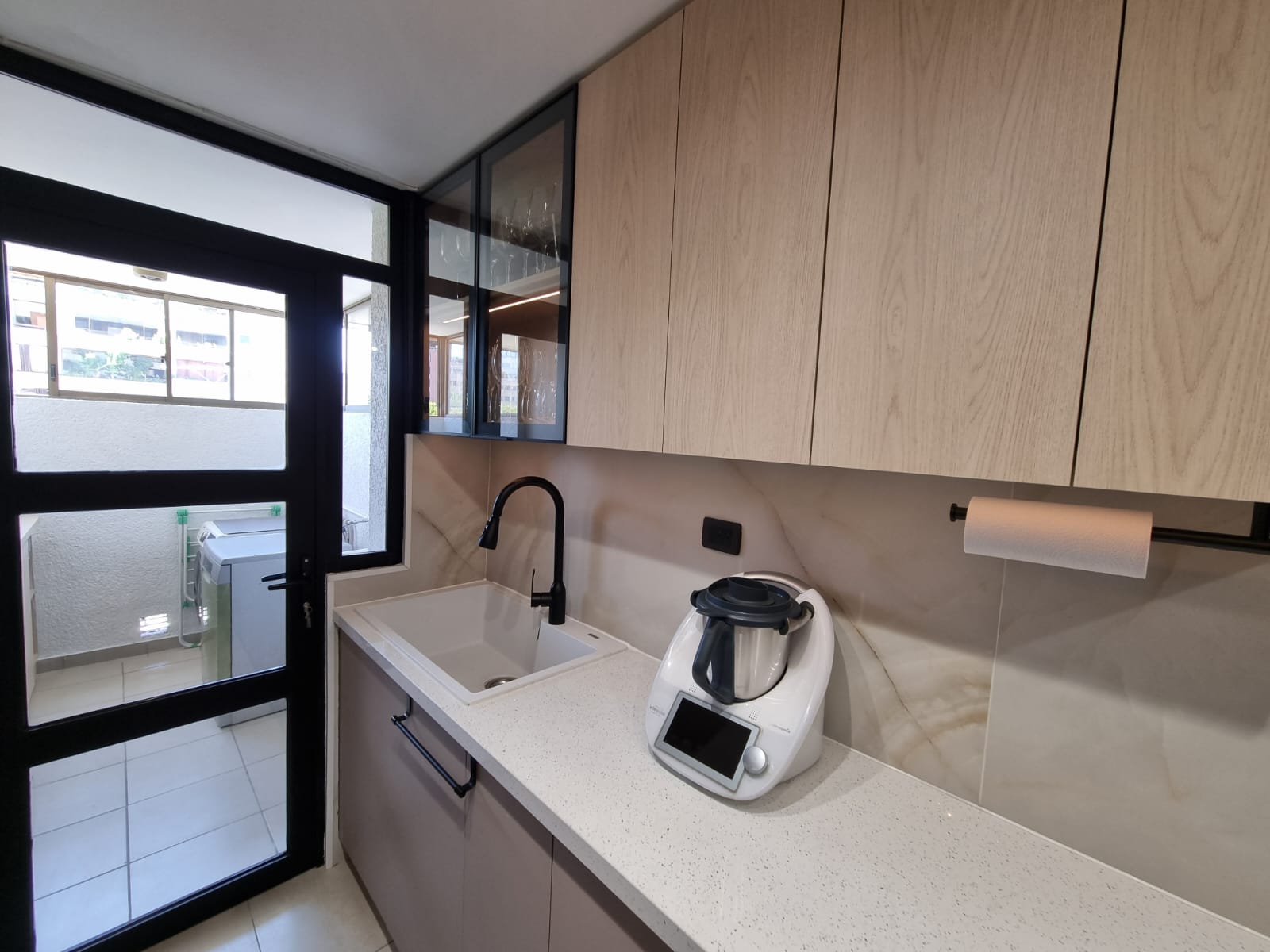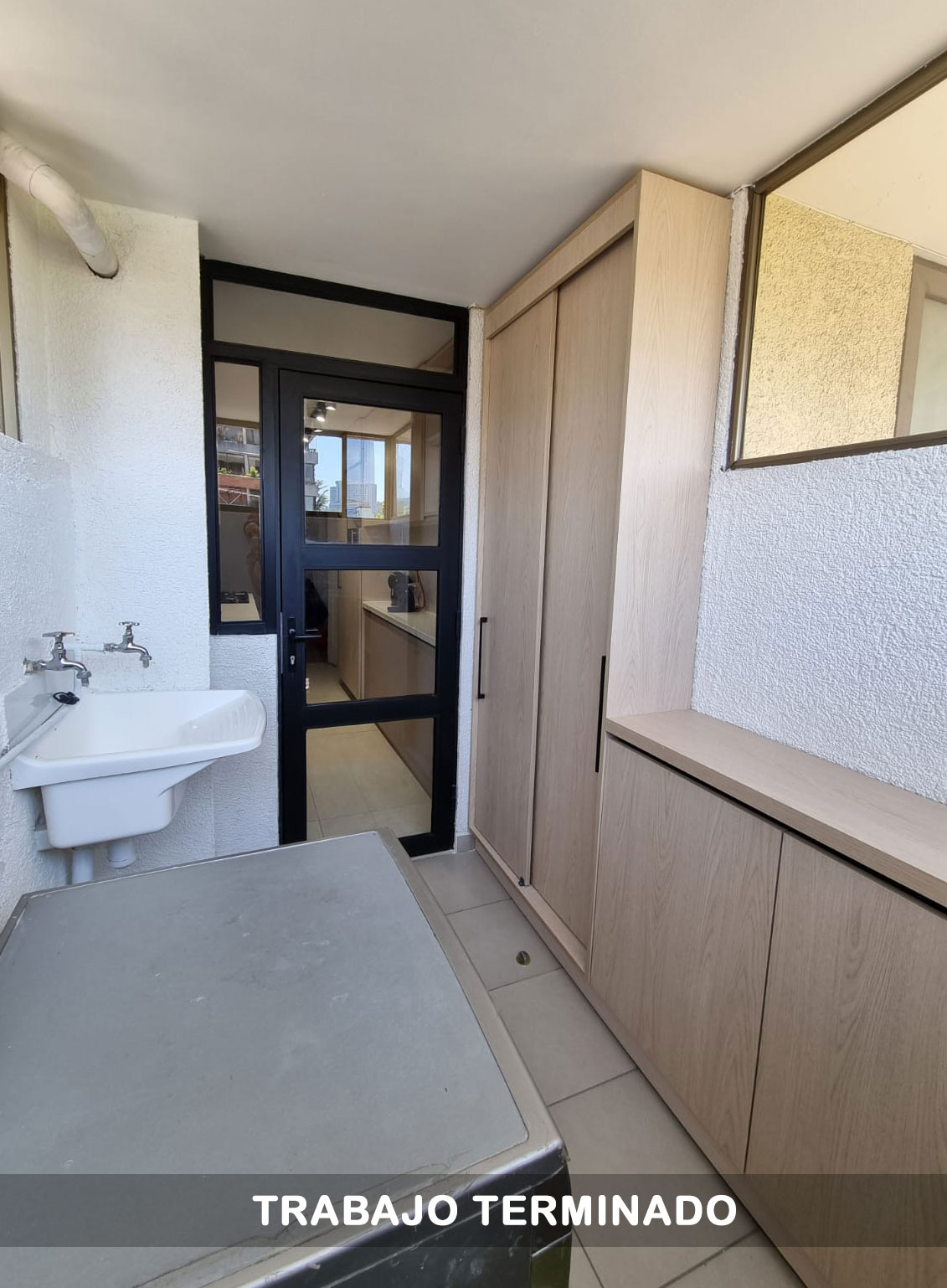En la logia, diseƱamos soluciones de almacenamiento a medida que permiten ocultar instalaciones y mantener el orden, generando continuidad visual con la cocina.